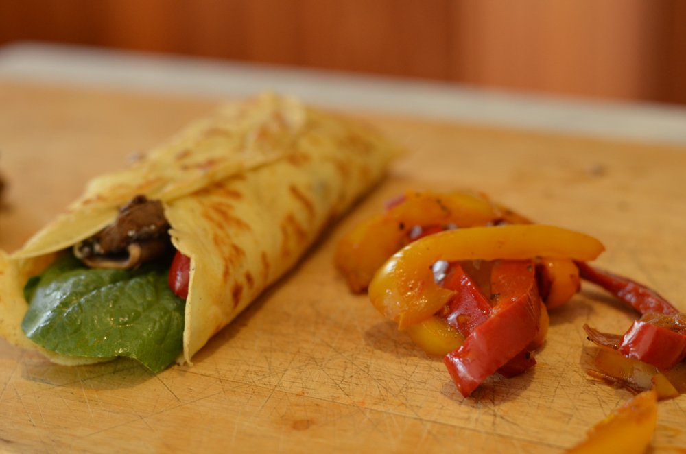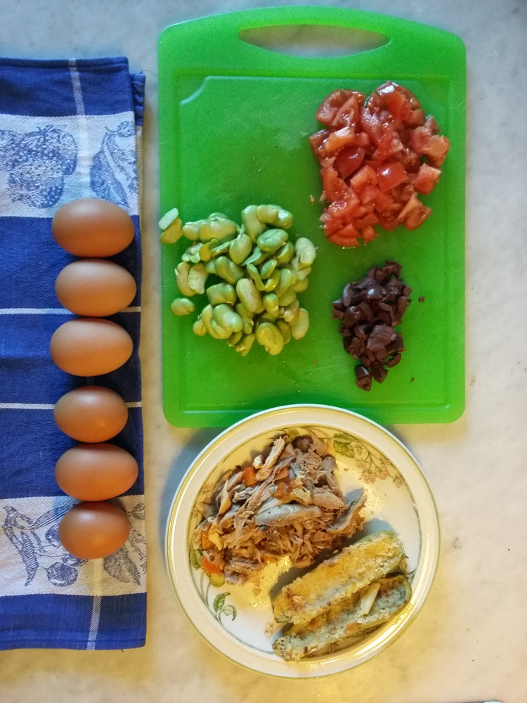 I had some fresh broad beans (Ful) and leftover chicken which we chopped up with some tomatoes and black olives. We cooked the ingredients a little in a hot skillet before mixing in beaten eggs and seasoning.