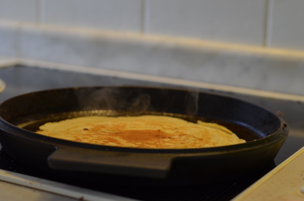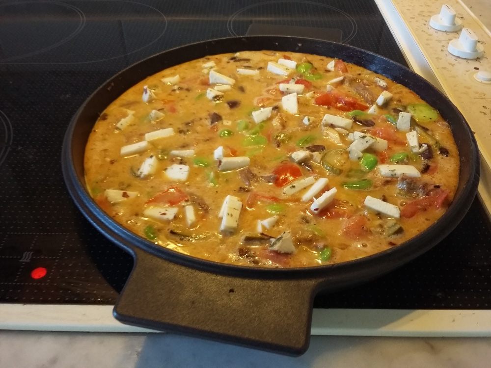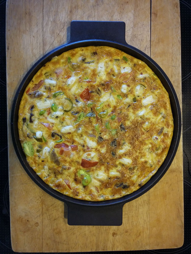 One big advantage of cooking with cast iron dishes (as long as there is no wooden handle) is that they can handle the direct heat from the hob as well as the heat from the oven. So after a few minutes, I put the skillet under the grill to cook the omelette from the top. And that’s it! It’s a simple but tasty meal that can be made with almost any ingredients you feel like chucking in.