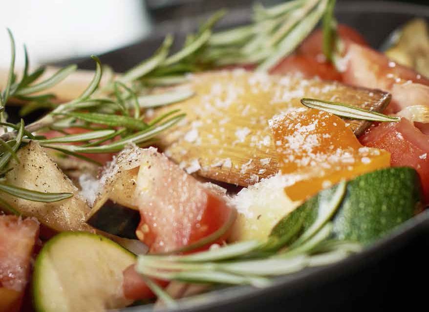 Stir occasionally for a few minutes until the onion has turned clear but not brown. Then add the bell pepper and stir again, followed by the aubergine and courgette. Finally add the chopped tomato, thyme, rosemary and a little salt and pepper.
