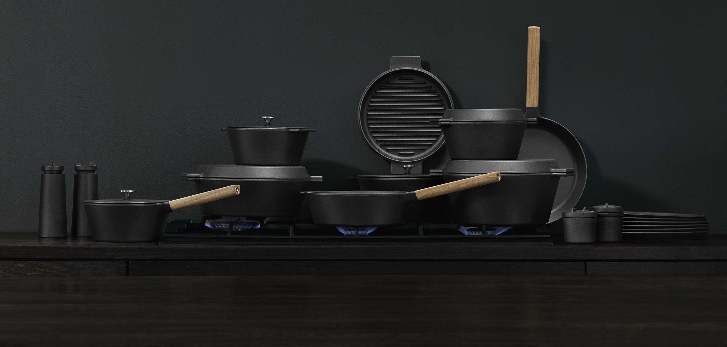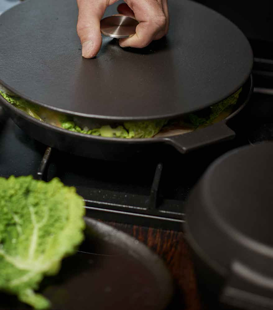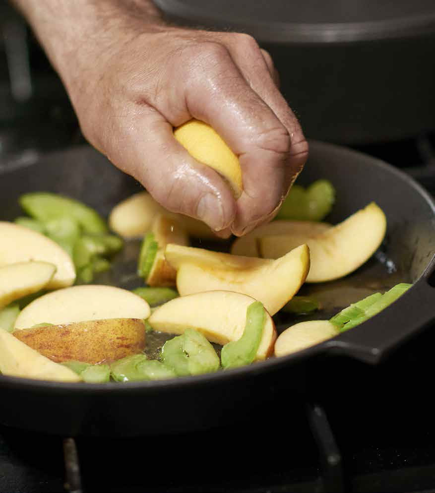 Heat the butter in a cast iron pot / saut. pan and add the apple and celery. Simmer for a few minutes without colouring.