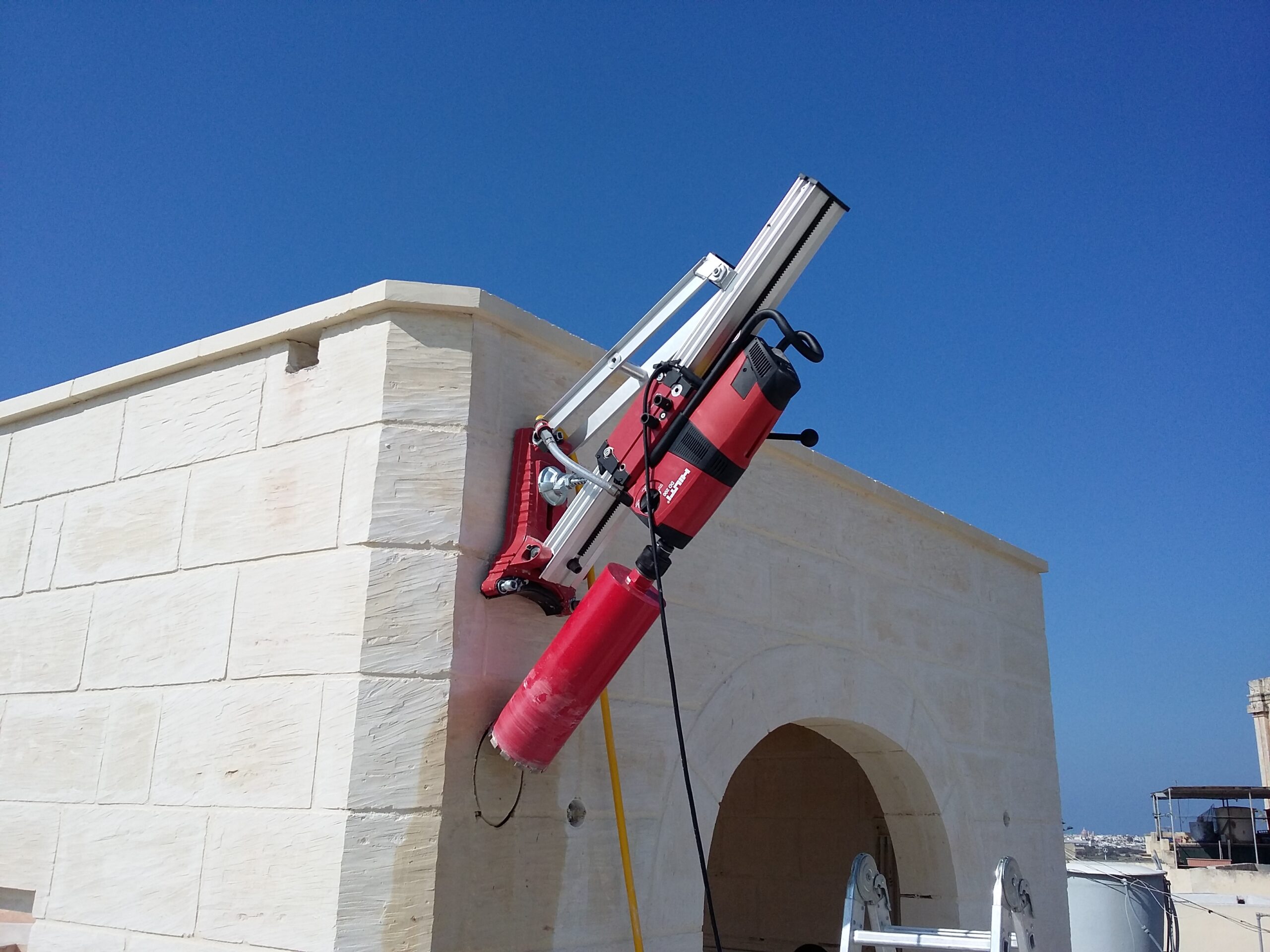 Our core drilling machines can core holes up to 400mm in diameter in Maltese limestone, ‘Xorok’, reinforced concrete or bricks. For larger unconventional shaped holes we use the ‘stitch drilling method’, which involves drilling a number of overlapping holes to drill out the shape needed.