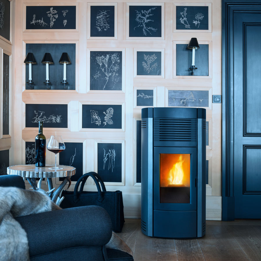 Pellet stove with steel structure, steel and cast iron cladding and cast iron brazier. Intelligent combustion management with Maestro WI-FI connection.