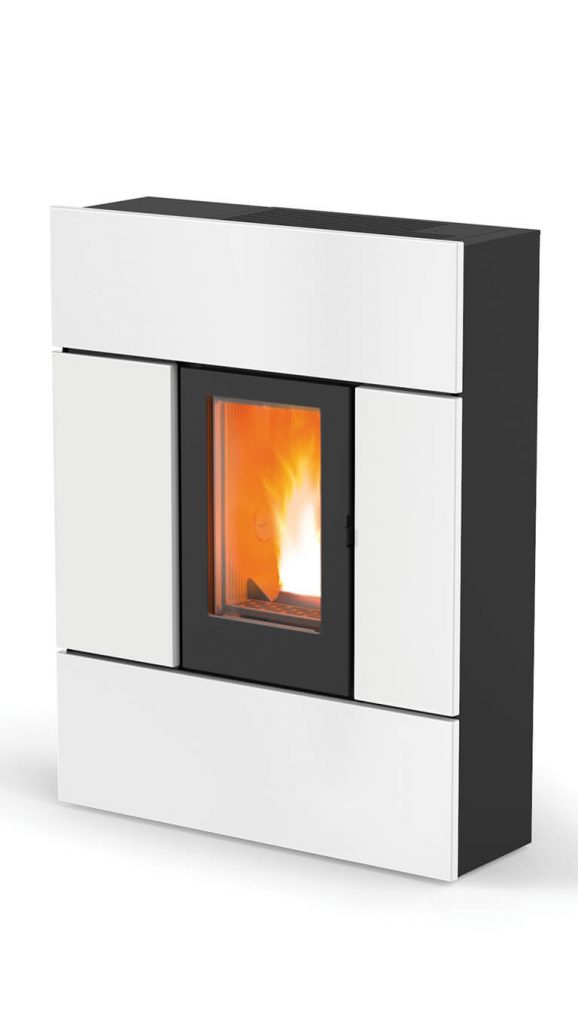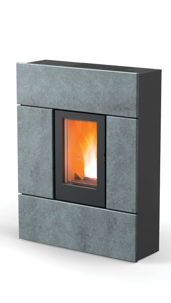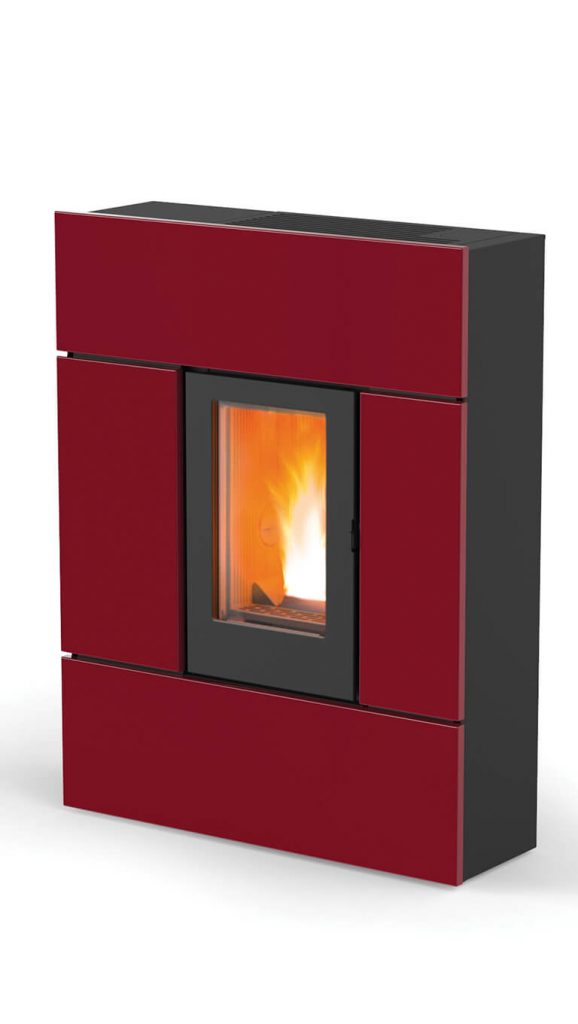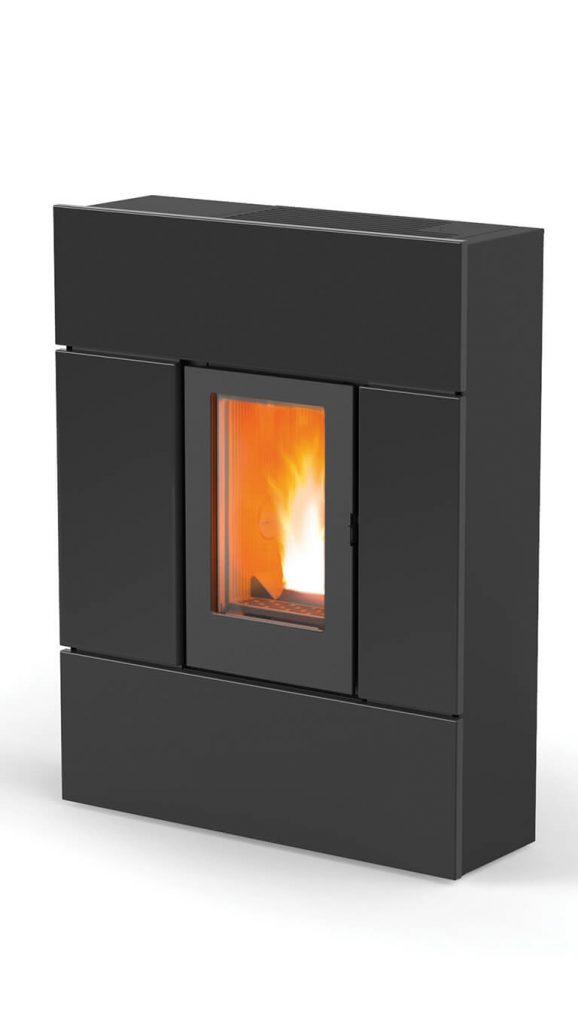 A shallow pellet stove (only 28.6 cm), particularly suitable for small spaces. Two air fans; one of which can be ducted to an adjacent room. This stove is available with a front stone (Serpentino) panel or steel or ceramic panels (Black, White, Bordeaux). The flue outlet can be positioned from the top or from the rear.