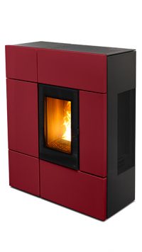 Pellet stove with no front vents, made with a painted steel structure, glass door and serpentine stone or painted steel cladding, either White, Bordeaux, Dark. Cast iron brazier. Intelligent combustion management with Maestro. Available with smoke outlet on the back or on top (UP! version).