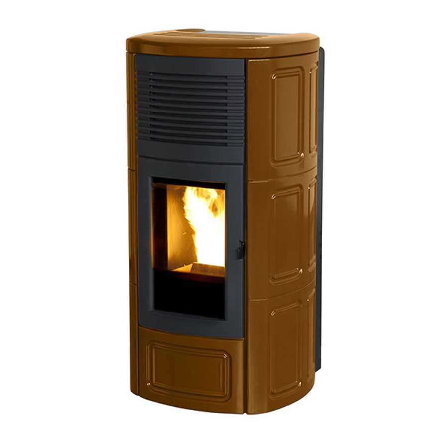 Pellet stove with steel structure, ceramic top and sides. Cast iron brazier. Intelligent combustion management with Active+. Remote control with room thermostat as standard.